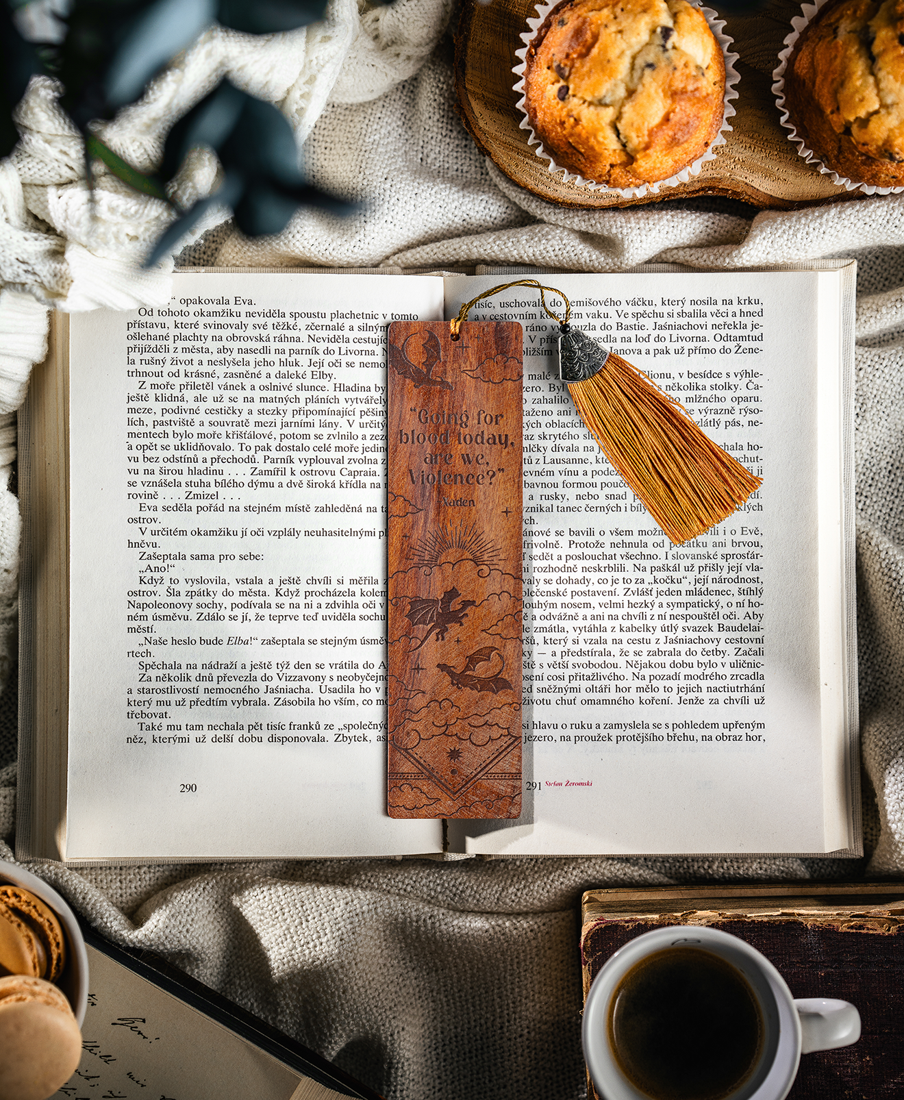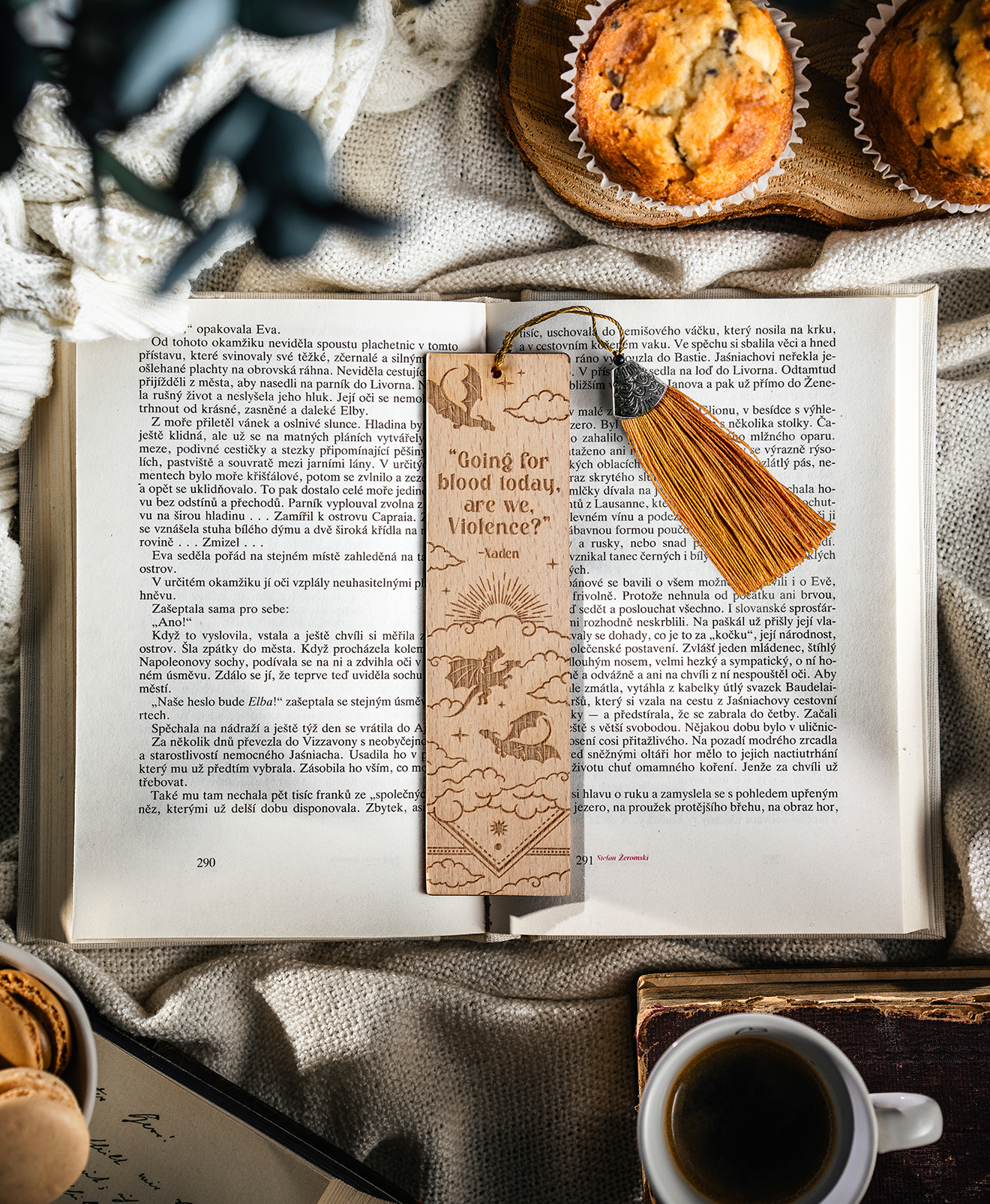 „Going for blood today, are we, Violence?“ – Xaden Riorson a jeho provokativní humor, pod kterým to nebezpečně jiskří. Tato dřevěná záložka potěší všechny, kdo v drsném světě Basgiathu hledají především tu jiskřivou chemii mezi postavami.