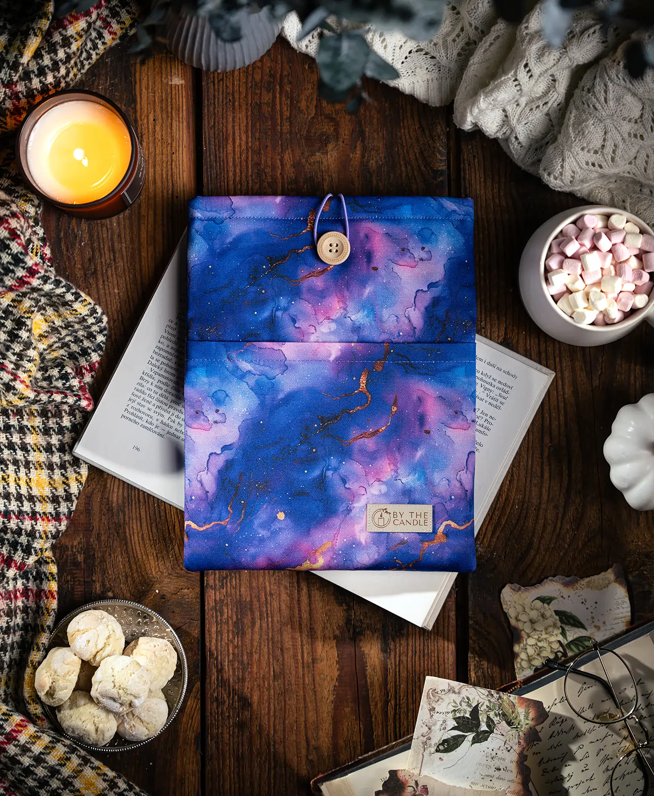 Látky necháváme potisknout designy, o které je mezi knihomoly největší zájem. K potisku ladí barva vnitřku i detaily jako barva obšití a gumičky na zavírání přes dřevěný knoflík. Luxusní booksleeve By The Candle se stane oblíbeným doplňkem vaší výbavy na cesty i na nočním stolku.