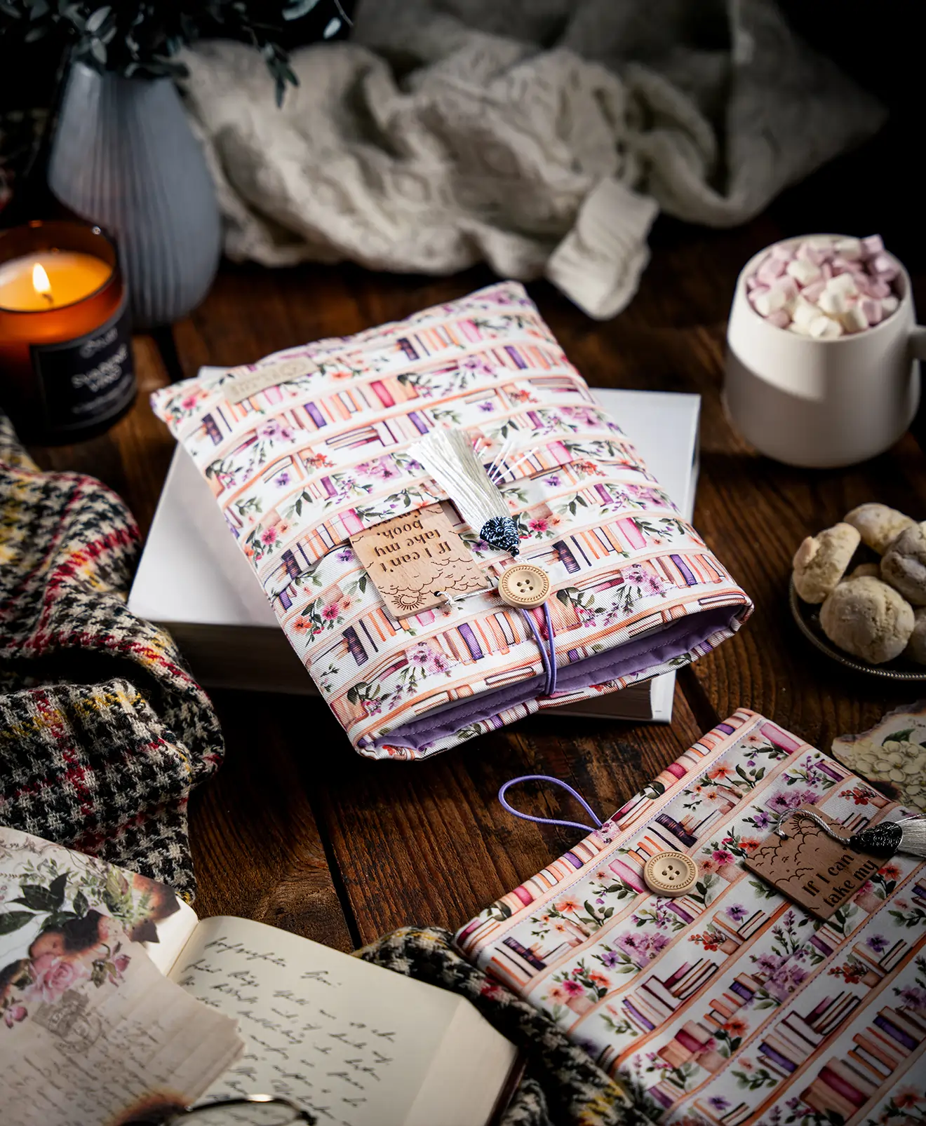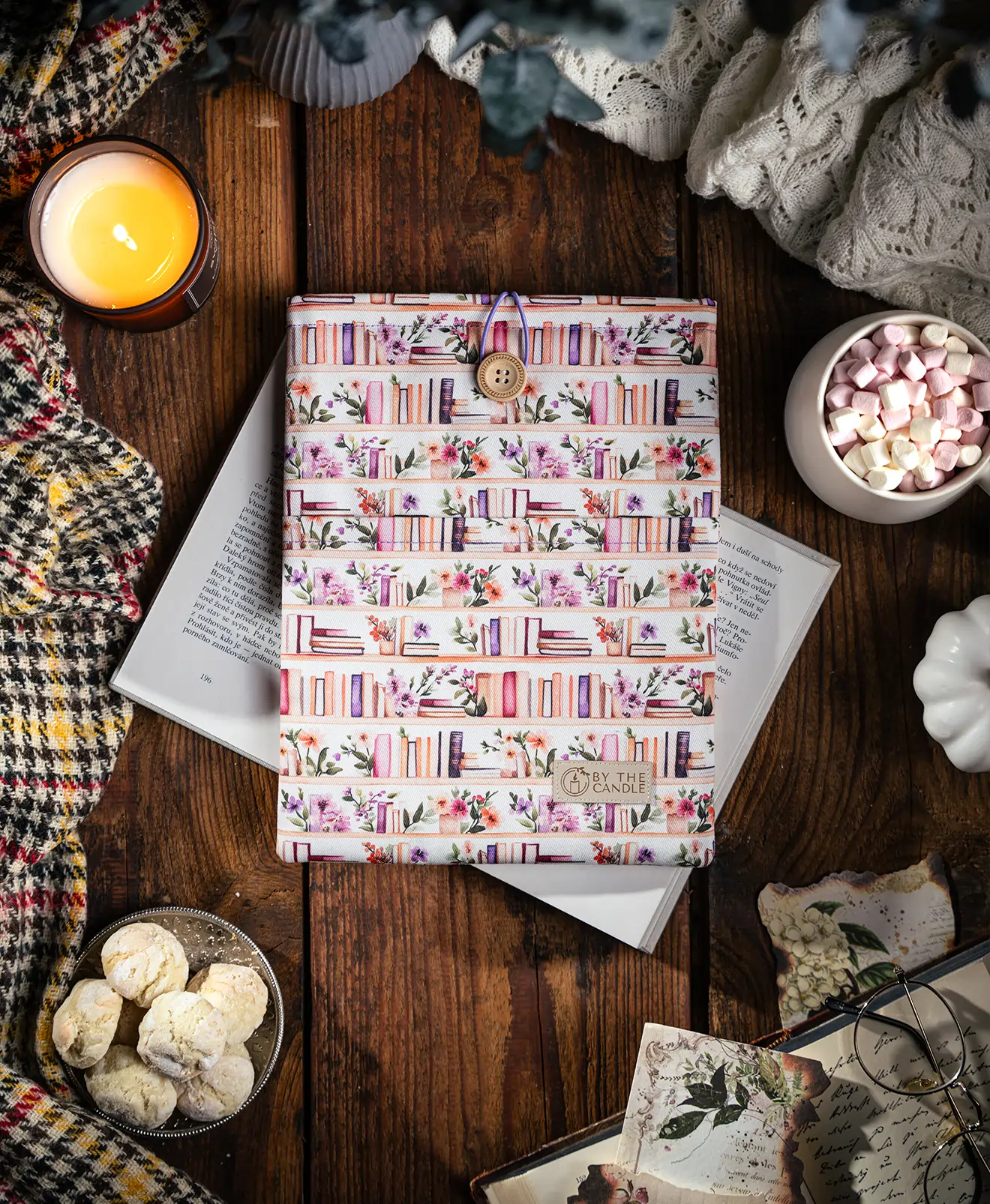 Látky necháváme potisknout designy, o které je mezi knihomoly největší zájem. K potisku ladí barva vnitřku i detaily jako barva obšití a gumičky na zavírání přes dřevěný knoflík. Luxusní booksleeve By The Candle se stane oblíbeným doplňkem vaší výbavy na cesty i na nočním stolku.