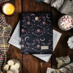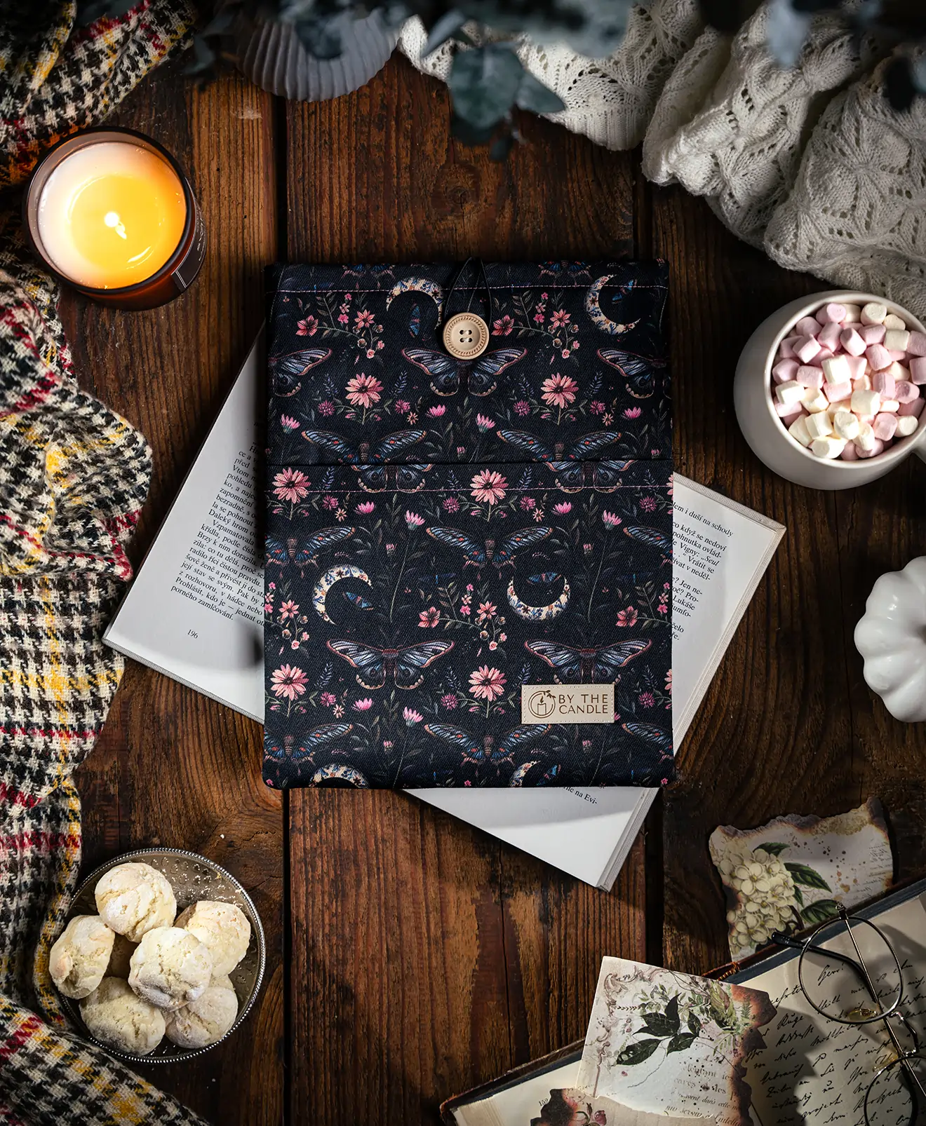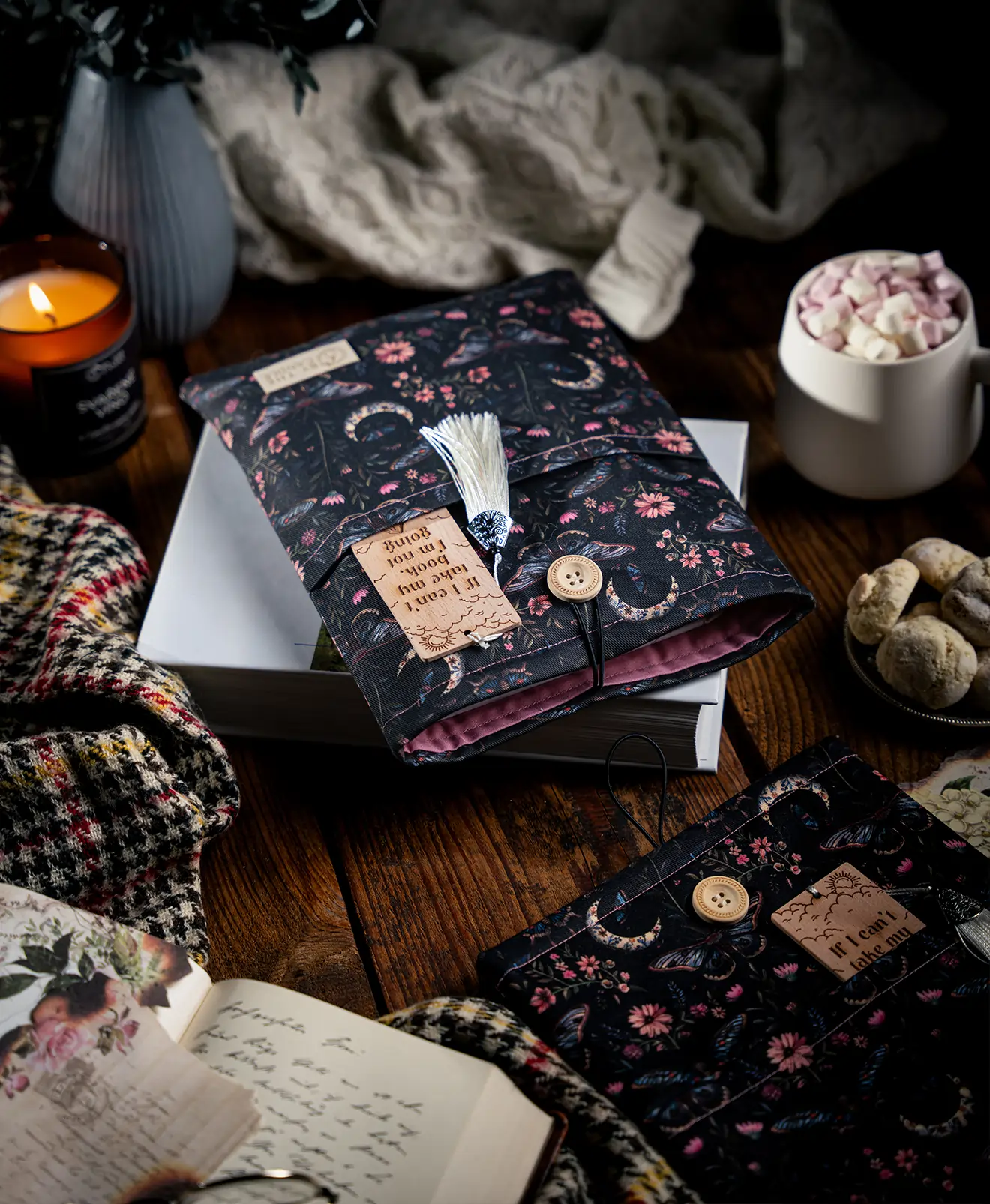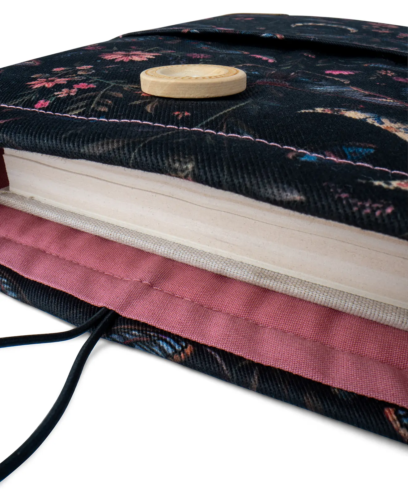 Ručně šitý látkový obal na knihy ze 100% bavlny s tmavým motivem plným květů a motýlů.